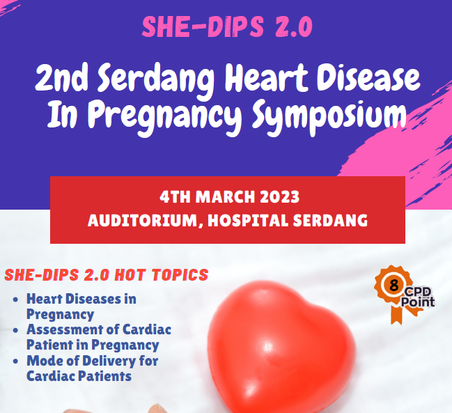 Upcoming Symposium on Heart Diseases in Pregnancy. Event on 4th March 2023 at Auditorium, Hospital Serdang Please click link to register. Programme topics: Learn about Heart Diseases that can occur during pregnancy, assessments of cardiac patients in pregnancy, and suitable mode of delivery for cardiac patients. Matters of discussion will be ever important in providingContinue reading “Event #2 : 2nd Serdang Heart Disease In Pregnancy Symposium”